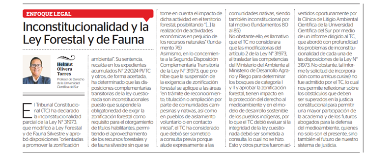 El 4 de abril del 2025, se publicó en el Diario Oficial El Peruano, una columna elaborada el docente Helmut Olivera, titulada “Inconstitucionalidad y la ley forestal y de fauna”, en la que se analiza la declaración de inconstitucionalidad parcial de la Ley N.º 31973, que modificaba la Ley Forestal y de Fauna Silvestre.
