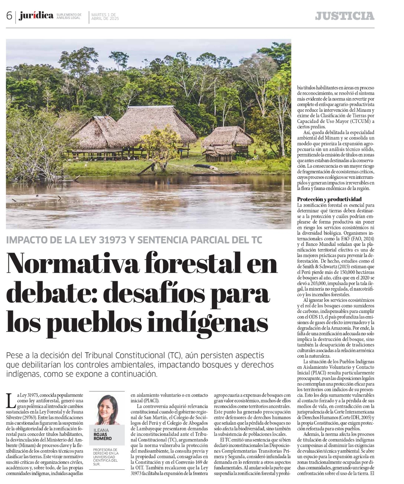El pasado 1 de abril del 2025, la profesora Ileana Rojas Romero, docente de la Facultad de Derecho y Economía de la Universidad Científica del Sur, publicó un artículo en el Suplemento Jurídica del Diario Oficial El Peruano titulado “Normativa forestal en debate: desafíos para los pueblos indígenas”. Es preciso destacar que, la profesora Ileana Rojas es especialista en derecho ambiental y pueblos indígenas, y ha participado activamente en debates sobre políticas públicas con enfoque ecológico y de derechos humanos.