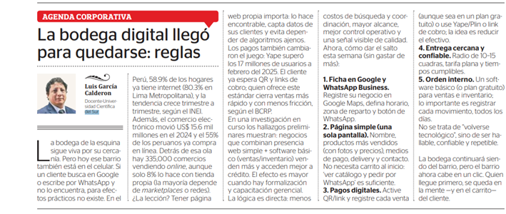En noviembre del 2025, el Mg. Luis García Calderón, docente de la Facultad de Derecho y Economía de la Universidad Científica del Sur publicó una columna en el diario oficial El Peruano, titulada “La bodega digital llegó para quedarse: reglas”, hecho que constituye un logro destacado por la proyección que otorga a la producción de conocimiento aplicado sobre transformación digital y economía de los pequeños negocios. Este logro refuerza el posicionamiento de la facultad como referente en temas de innovación, regulación económica y emprendimiento, y proyecta la labor docente hacia el debate público y las políticas que afectan al comercio de barrio y a los consumidores.